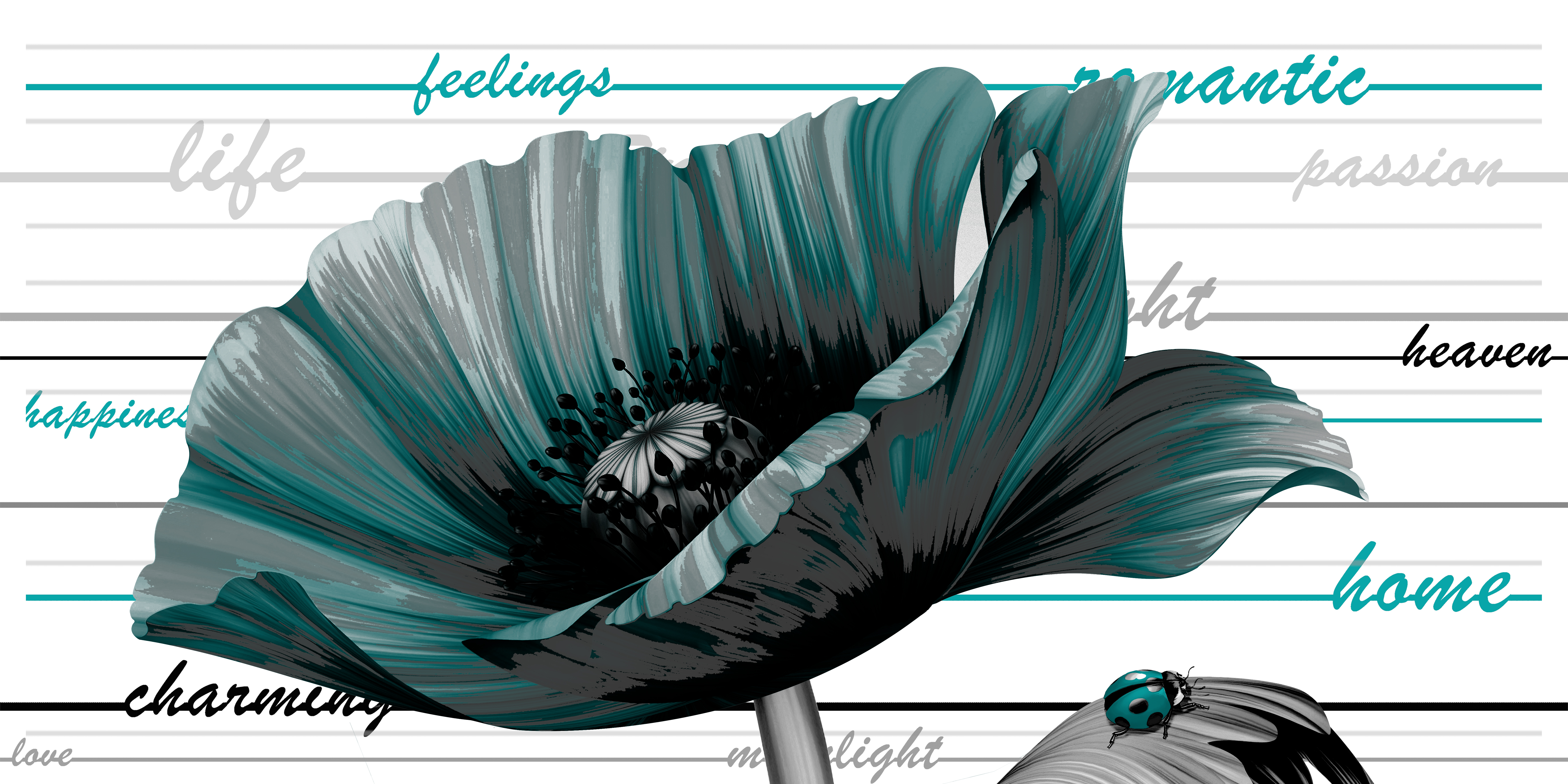 من امتزاج جمال الطبيعة و روح العصر نسج لنا الفنان تصميم مبهجاً للنباتات و الزهور، و اخذ التصميم طابع جريء في الوانه و تفاصيلة و وضع على خلفية حرة مرصعة بالخطوط و الحروف، مما اعطى التصميم روح الحداثة مع اختيار الالوان التركواز و الابيض، ليكونوا معاً رؤية حديثة لحمام راقي مميز لمحبي الخصوصية و الانفراد.