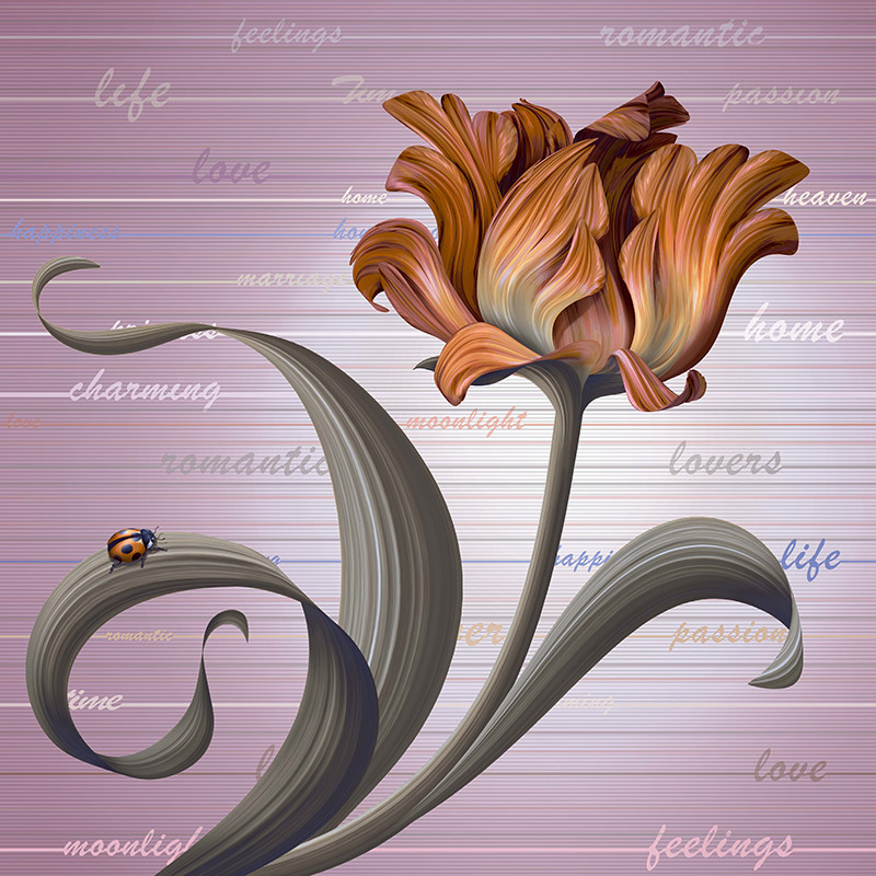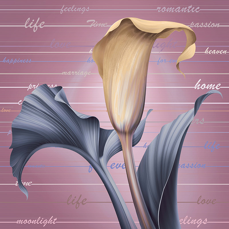 من امتزاج جمال الطبيعة و روح العصر نسج لنا الفنان تصميم مبهجاً للنباتات و الزهور، و اخذ التصميم طابع جريء في الوانه و تفاصيلة و وضع على خلفية حرة مرصعة بالخطوط و الحروف، مما اعطى التصميم روح الحداثة مع اختيار الالوان من البرتقالي الساخن و البنفسجي العميق و الابيض، ليكونوا معاً رؤية حديثة لحمام راقي مميز لمحبي الخصوصية و الانفراد.